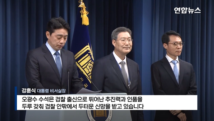 강 비서실장은 "오 민정수석은 검찰 출신으로 뛰어난 추진력과 인품을 두루 갖춰 검찰 안팎에서 두터운 신망을 받고 있다"며 "특히 이 대통령의 검찰개혁 철학을 깊이 이해하는 인사로, 대통령의 개혁 의지를 뒷받침할 것"이라고 밝혔습니다.