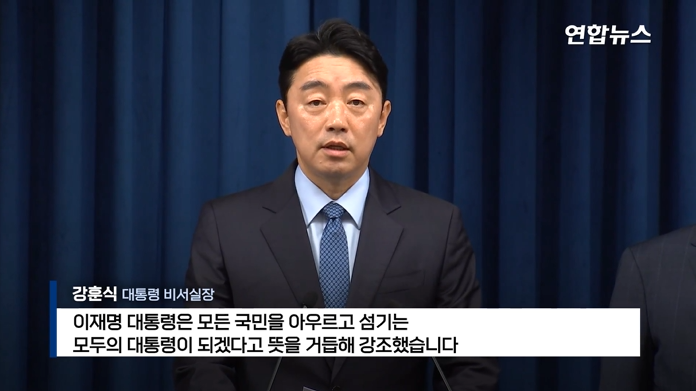강훈식 비서실장은 "이재명 대통령은 모든 국민을 아우르고 섬기는 '모두의 대통령'이 되겠다는 뜻을 거듭 강조했다"며 "이번 인사는 국민통합의 의지가 반영된 것"이라고 밝혔습니다.