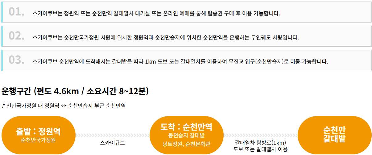 스카이큐브는 순천만국가정원과 순천만습지를 연결하는 무인 경전철로, 정원역 ↔ 순천만역을 오가는 친환경 교통 수단입니다. 정원 입장권을 소지한 관람객만 이용 가능하며, 별도 매표가 필요합니다.