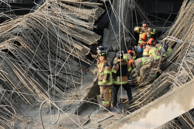 - 13시 58분경: 콘크리트 타설 중 2층 옥상 철제 구조물이 붕괴했다는 신고가 소방당국에 접수, 상층 구조물이 아래로 떨어지며 지하층까지 연쇄 붕괴 발생