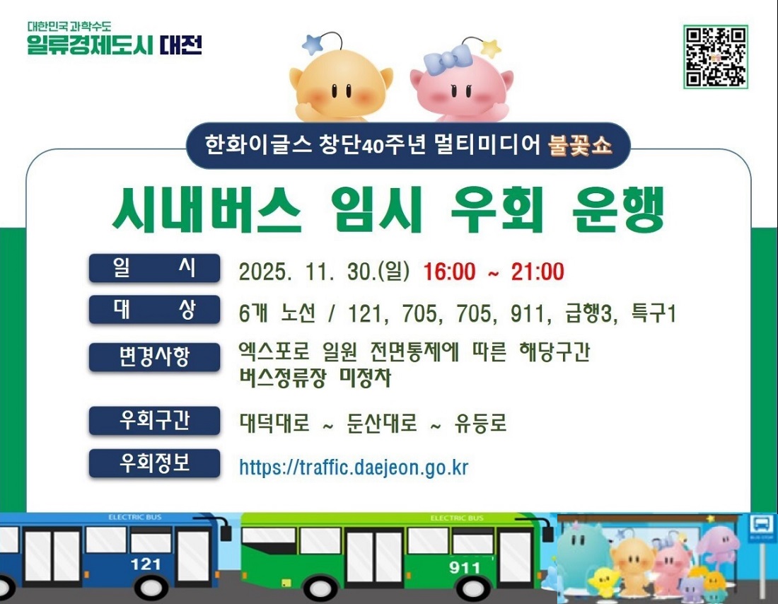 한화이글스 40주년 불꽃쇼 기간에는 엑스포로 통제로 인해 6개 시내버스 노선이 우회 운행되며, 일부 정류장은 일시적으로 정차하지 않습니다.