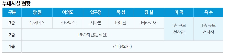 | 회차 | 잠실 | 뚝섬 | 옥수 | 압구정 | 여의도 | 망원 | 마곡 |