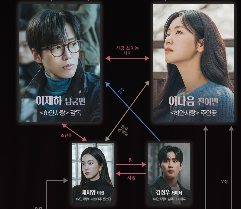 이제하는 아버지의 대표작 하얀사랑의 리메이크를 준비하지만, 창작의 벽에 부딪힌 창작자입니다. 이다음은 시한부 판정을 받고 마지막 기회로 오디션에 도전하는 배우 지망생이죠.