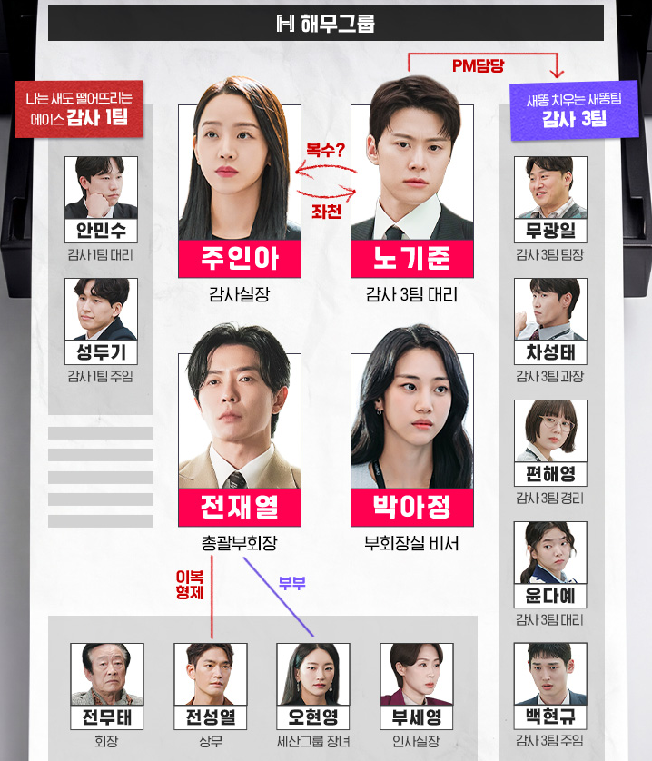 이외에도 감사3팀 구성원들과 해무그룹 내부 인물들이 다수 등장하며, 각 인물은 단순한 배경이 아니라 사건과 관계를 확장시키는 역할을 합니다. 따라서 주요 인물뿐 아니라 팀 단위의 움직임을 함께 보는 것이 드라마 이해에 도움이 됩니다.