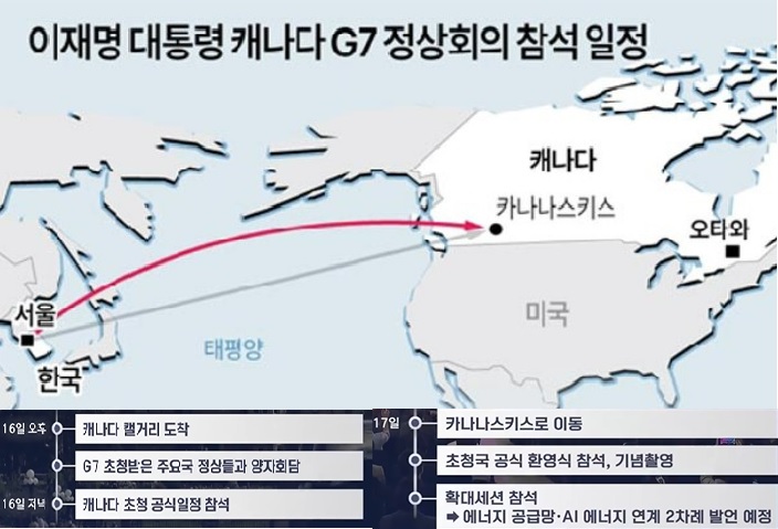 이재명 대통령이 2025년 6월 16일부터 G7 정상회의 참석차 첫 해외 순방에 나섭니다.