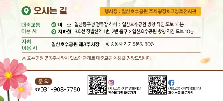 - 자가용: 일산호수공원 제3주차장 (승용차 5분당 80원, 주말 혼잡)