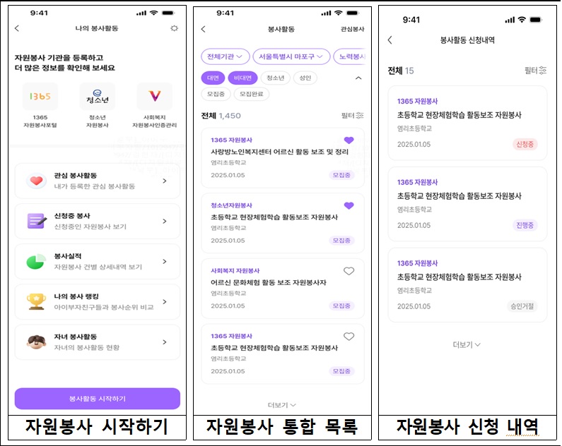 기존에 분산 운영되던 1365자원봉사포털, VMS, DOVOL의 이력을 민간 앱에서 통합 확인 및 신청 가능