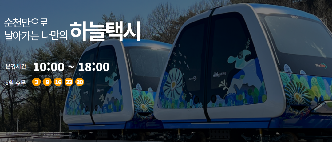 스카이큐브는 순천만국가정원과 순천만습지를 연결하는 무인 경전철로, 정원역 ↔ 순천만역을 오가는 친환경 교통 수단입니다. 정원 입장권을 소지한 관람객만 이용 가능하며, 별도 매표가 필요합니다.