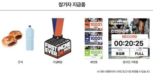 - 지급물품 : 기념품, 배번호, 대회책자, 완주메달, 온라인 기록증(5km 제외), 기록칩(5km 제외)