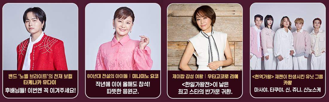 한일 멘토단에는 트로트, J팝, 밴드, 그룹 등 여러 장르를 대표하는 인물들이 함께 포함돼 있습니다. 그래서 이번 시즌은 단순한 한일 가창 대결을 넘어 세대와 장르가 섞이는 무대 구성이 강점으로 꼽힙니다.